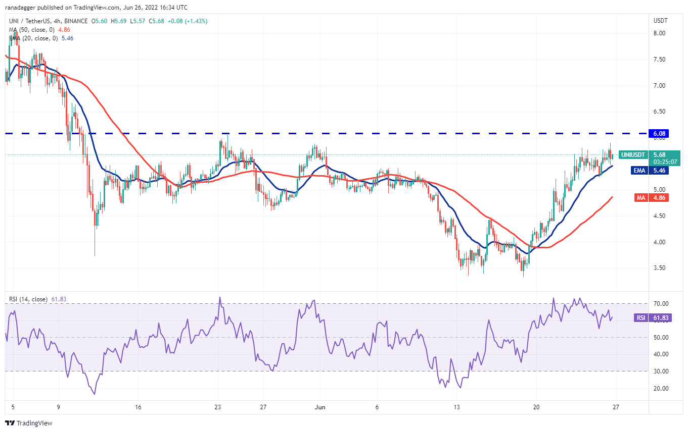 Uniswap (UNI) rebounded sharply from $3.33 on June 18 and has reached the stiff overhead resistance at $6.08. The bears are defending the level aggressively but a minor positive is that the bulls have not given up much ground.