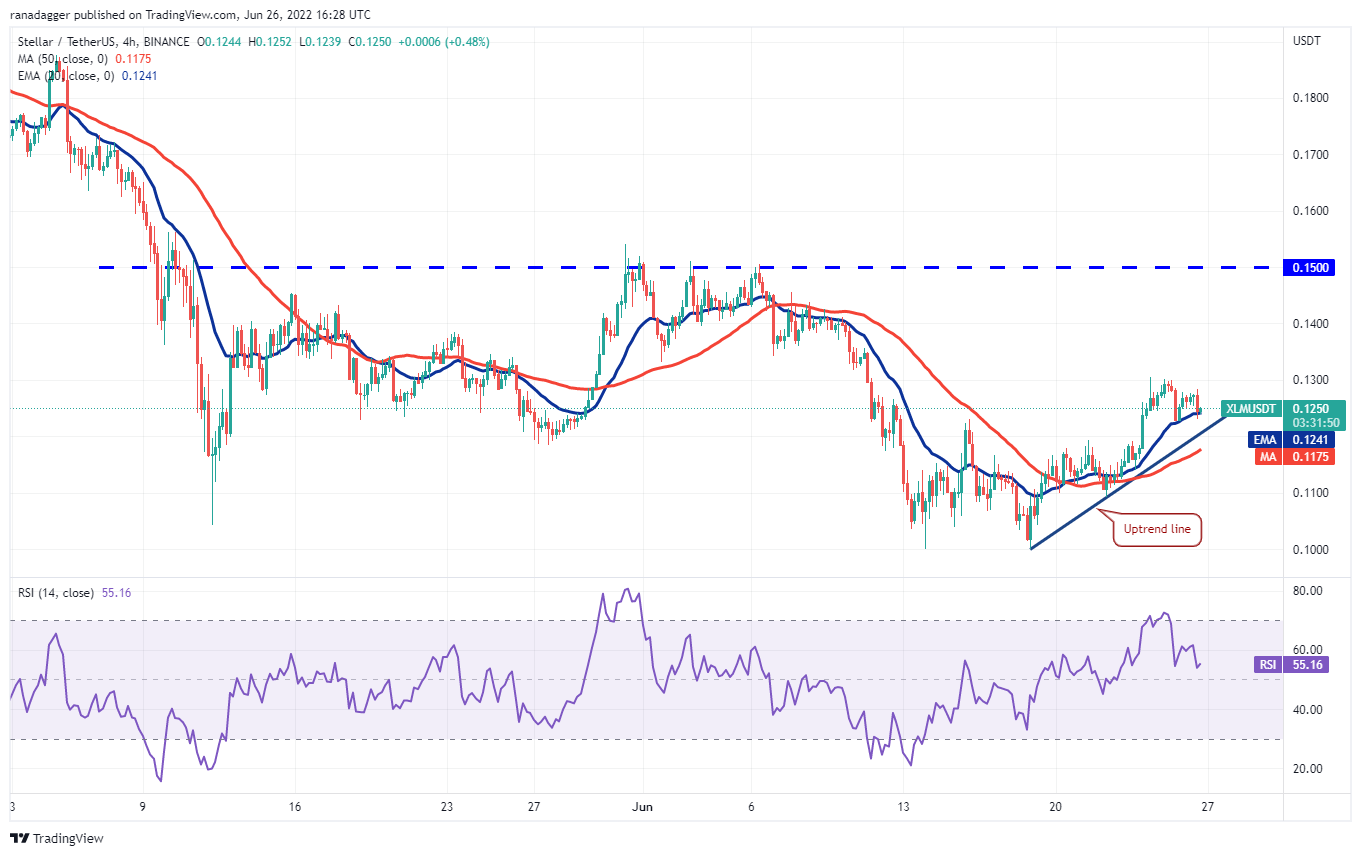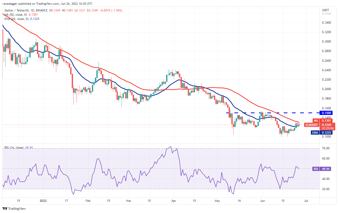 Stellar (XLM) has been in a strong downtrend but the bulls are attempting to form a bottom near $0.10. The buyers pushed the price above the 20-day EMA ($0.12) on June 24 but could not clear the hurdle at the 50-day SMA ($0.13).