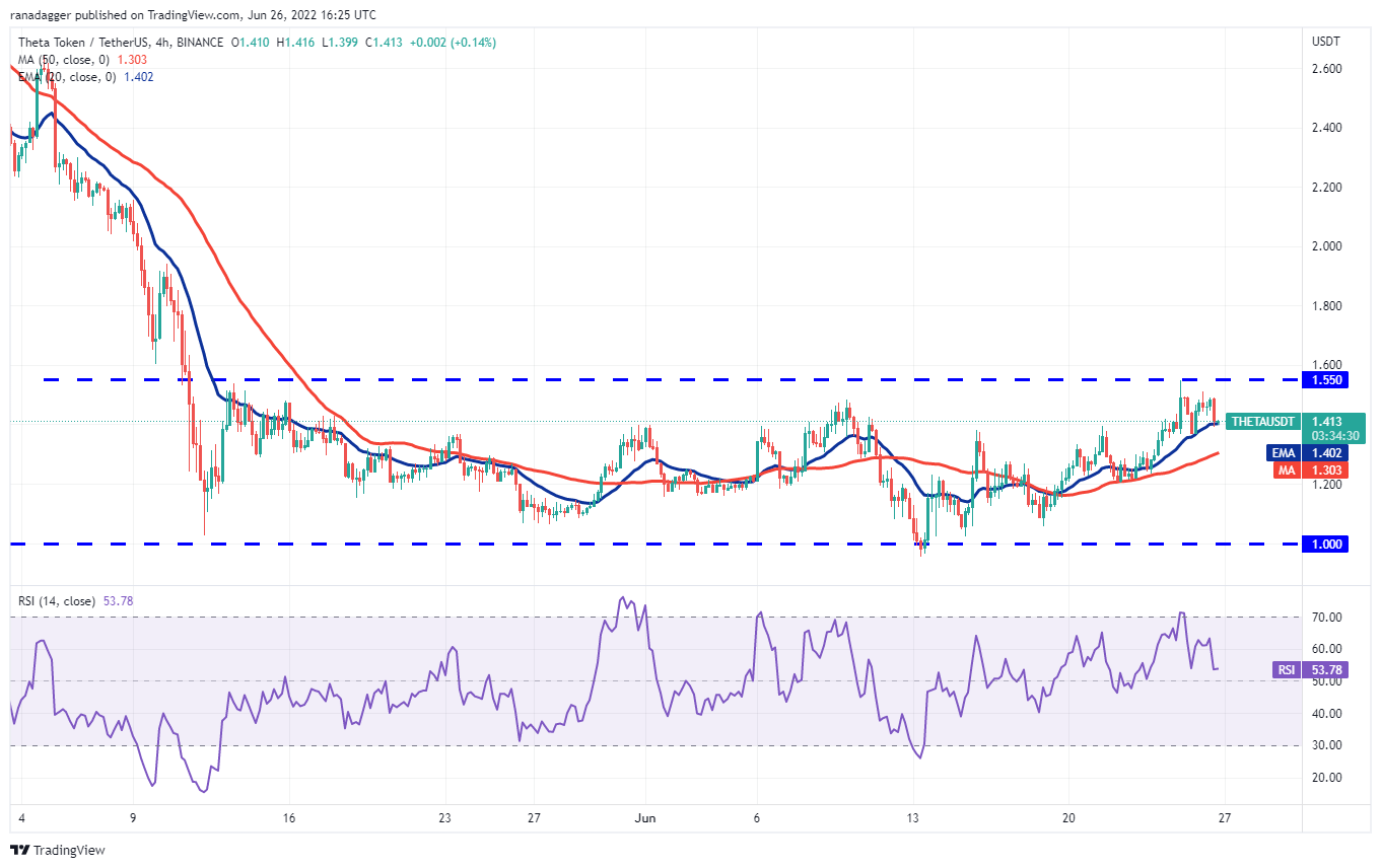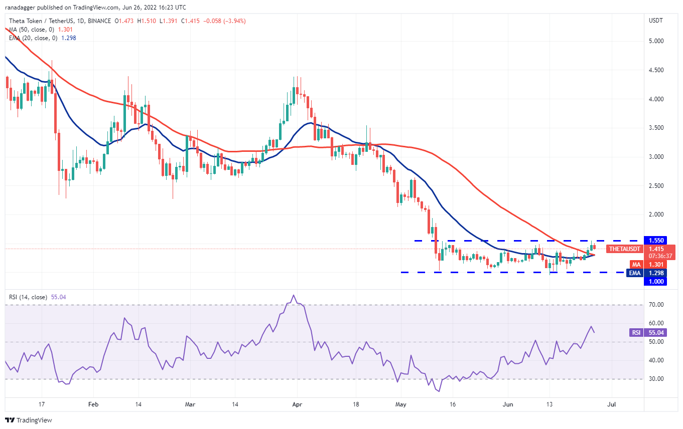Both moving averages are on the verge of completing a bullish crossover and the RSI is in the positive territory. This suggests that bulls have a slight edge. If buyers push the price above $1.55, it will suggest the start of a new up-move. The THETA/USDT pair could then rise to the pattern target of $2.10.