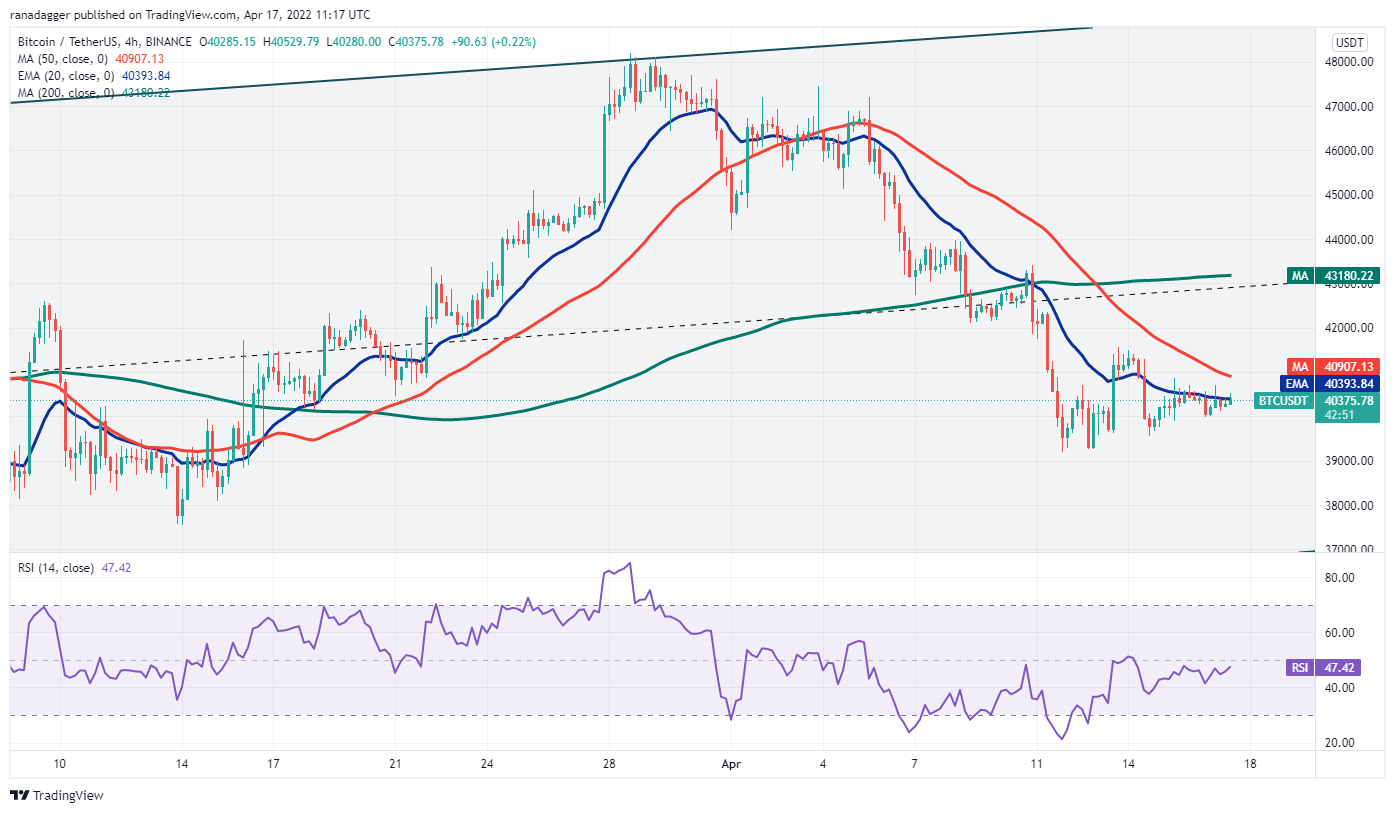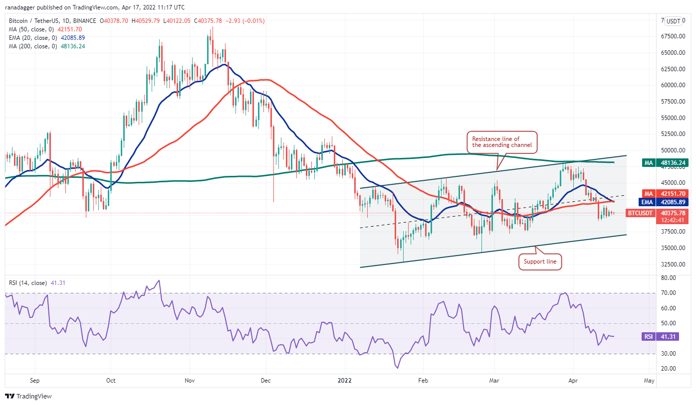 If the price breaks above $41,000 the bulls will attempt to push the BTC/USDT pair above the 20-day exponential moving average ($42,085). If they succeed, the pair could start an up-move to the overhead resistance at the 200-day simple moving average ($48,136) and later to the resistance line of the ascending channel.