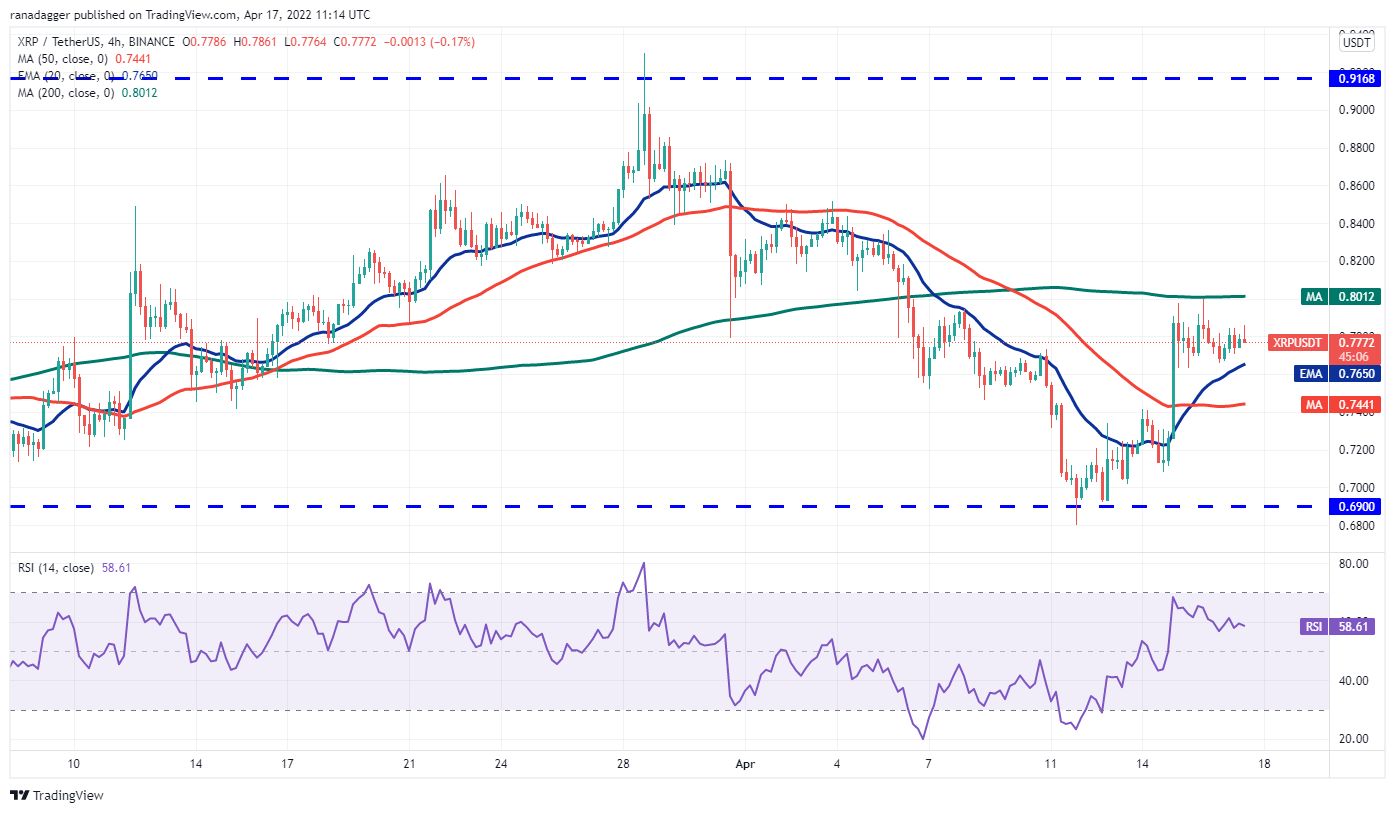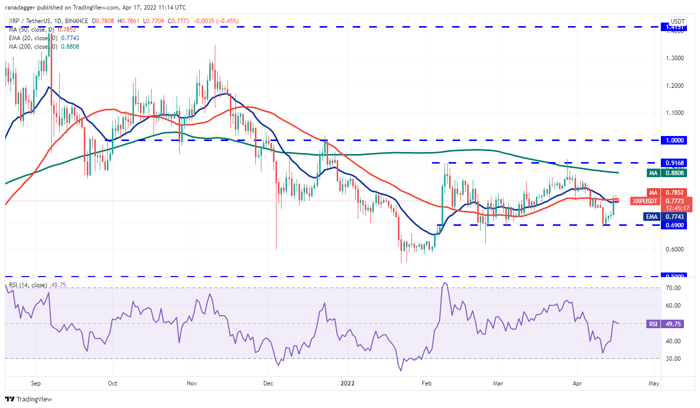 Ripple (XRP) rebounded sharply off the strong support at $0.69, indicating strong demand at lower levels. The bulls pushed the price above the 50-day SMA ($0.78) on April 15 but could not continue the up-move. However, a minor positive is that the bulls are attempting to sustain the price above the 20-day EMA ($0.77).