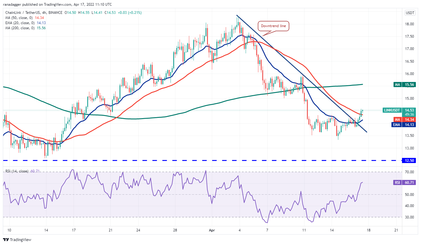 The first sign of strength will be a break and close above the 20-day EMA ($15). Such a move will suggest that the bears may be losing their grip. The LINK/USDT pair could then rise to $16 and later challenge the overhead resistance at $18. A break and close above this level could open the doors for a possible rally to the 200-day SMA ($21).