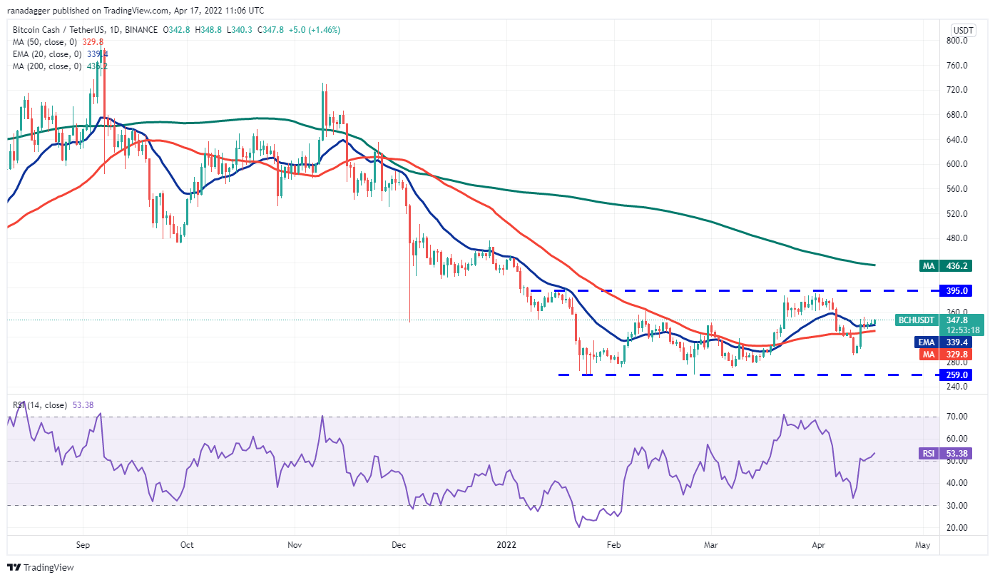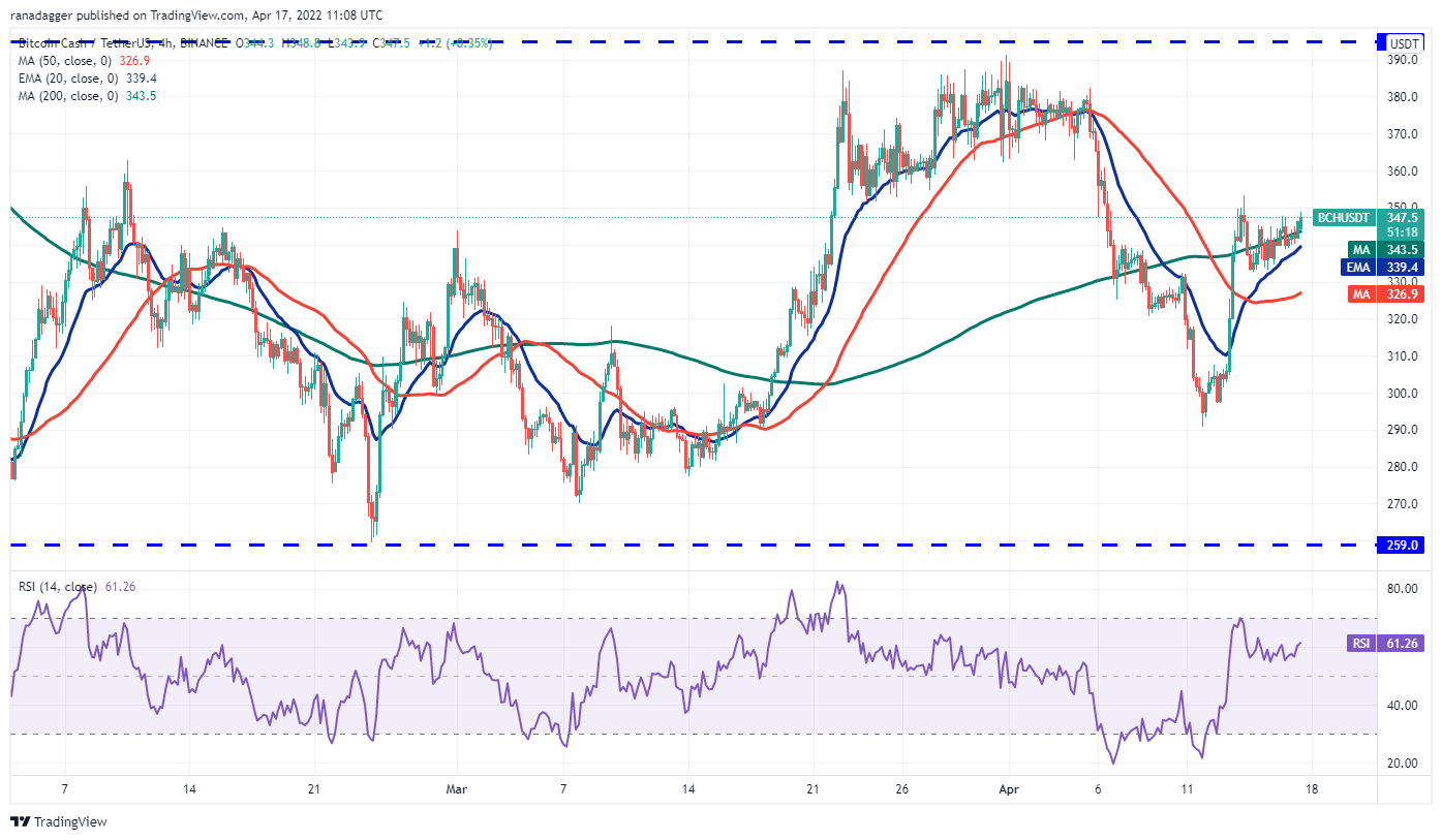 Bitcoin Cash (BCH) has been trying to form a bottom for the past several days. The price rose sharply on April 13 and broke above the 20-day EMA ($339). Although the bulls could not build upon the up-move, a positive sign is that they have not allowed the price to dip below the 50-day SMA ($329).