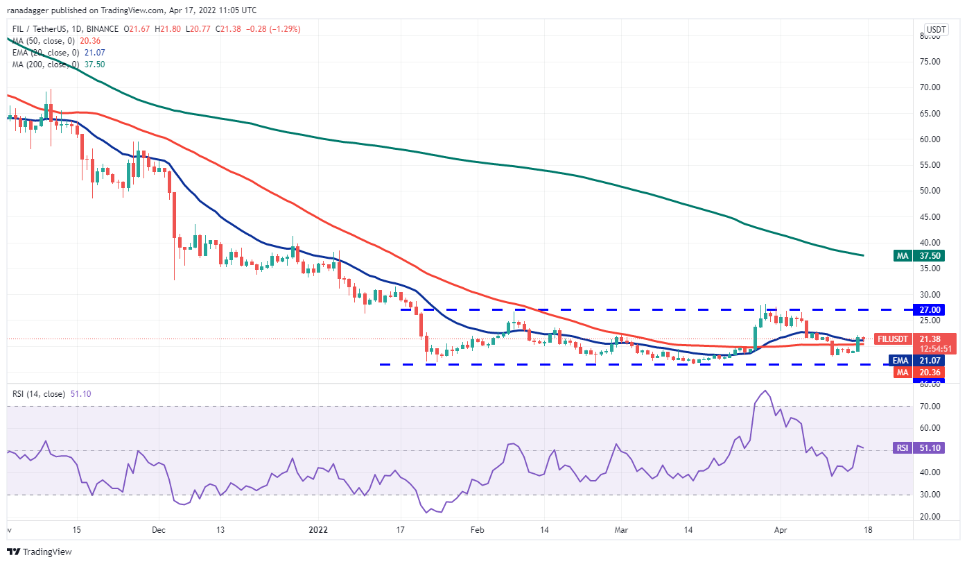 Filecoin (FIL) has been range-bound in a downtrend. The bulls are attempting to form a basing pattern and the price has been consolidating between $16.50 and $27 for the past few days.