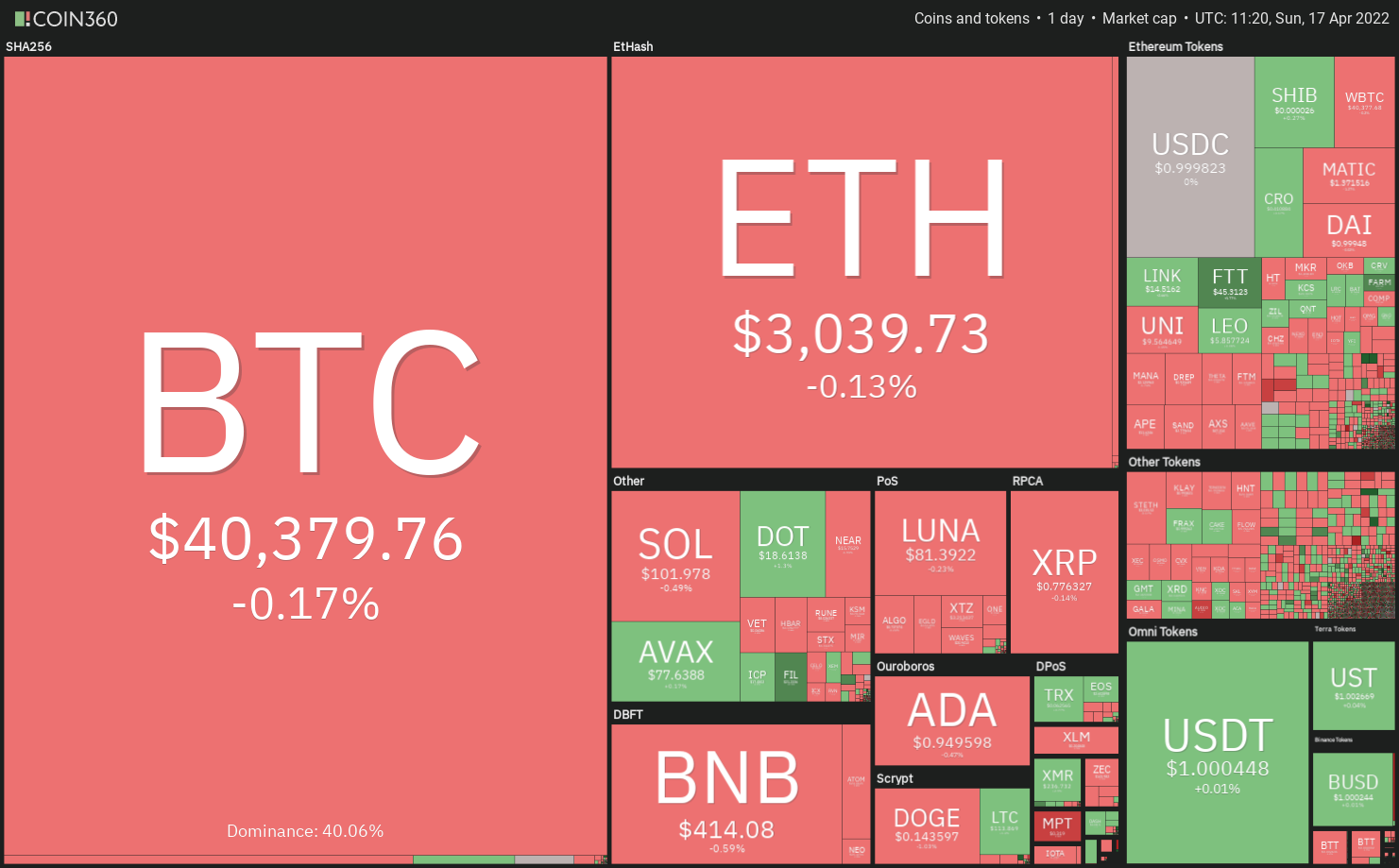 Bitcoin (BTC) and most major altcoins have been relatively quiet during the holiday period from Good Friday onward. This suggests that cryptocurrency traders are not initiating large bets during the period when the U.S. equities markets are closed. That could be because of the tight correlation between Bitcoin and the S&P 500 and the uncertainty about the equity market’s performance in the next week.