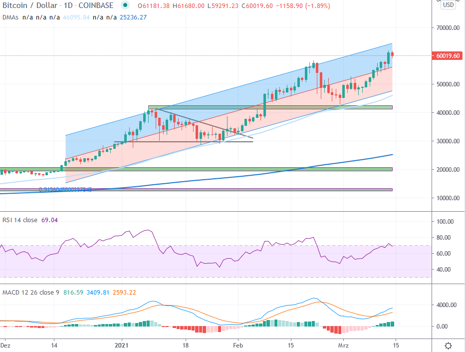 Since the breakout through the important USD 14,000 resistance at the beginning of November, it has been blow by blow. The break through the old all-time high at USD 20,000 saw a strong accentuation of the uptrend. Subsequently, the price doubled in only 23 days. A first correction brought the price back below USD 30,000. Thereafter, a renewed upward movement began, which finally led above the previously reached all-time high at USD 42,000 and marked a new all-time high just below USD 60,000 on February 21. After a correction, a new all-time high just below the 62,000 USD mark was recorded in the reporting week, after only 20 days.