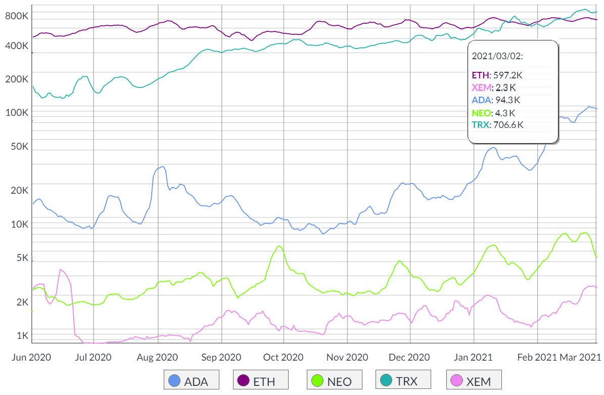 As shown above, the Ethereum network vastly dominates decentralized applications (dApps). Due to its high gas fees for transactions, when analyzing the number of active addresses, the Ethereum newtork appears to be at a disadvantage to its competitors.
