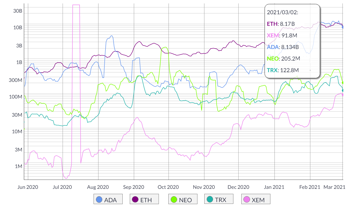 This data should, at least theoretically, be reflected in the market capitalization. Thus, it makes sense for Ethereum to dominate the ranking as no other network is even close to its decentralized applications.
