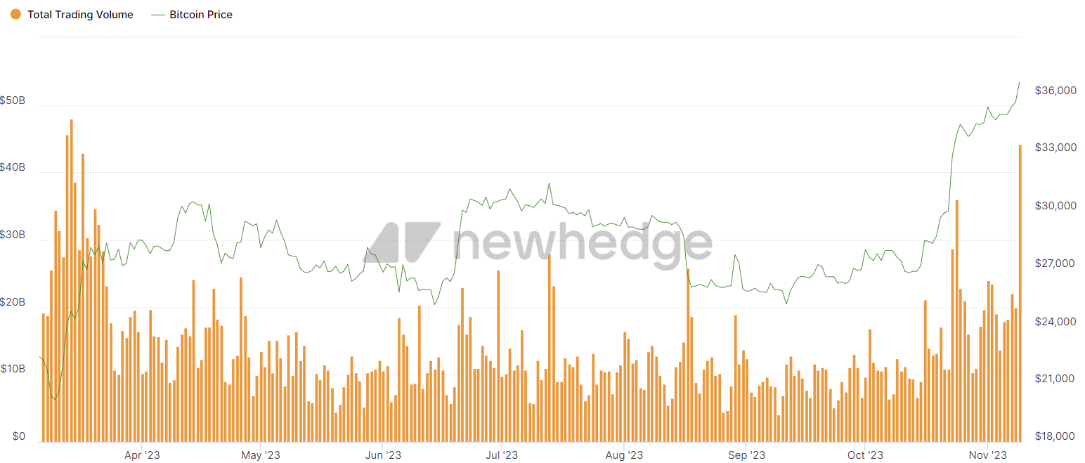The positive sentiment in the crypto market is rippling throughout the ecosystem. Bitcoin and crypto market trading volume reached $44.1 billion on Nov. 9. The increase is the highest level of total trading volume since March 14.