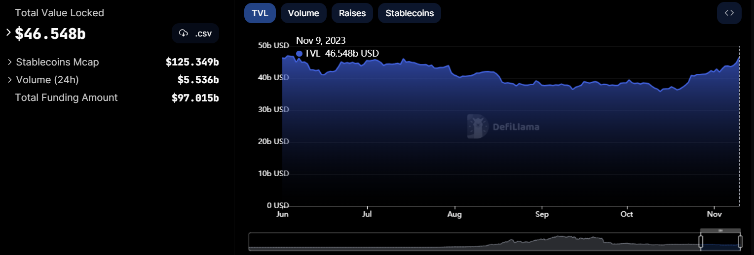 Trading volume is not the only metric that is breaking multiple-month highs. The total value locked (TVL) on Nov. 9 has reached its highest level since June 3. The TVL increase to $46.5 billion marks a 3.7% 24-hour increase.
