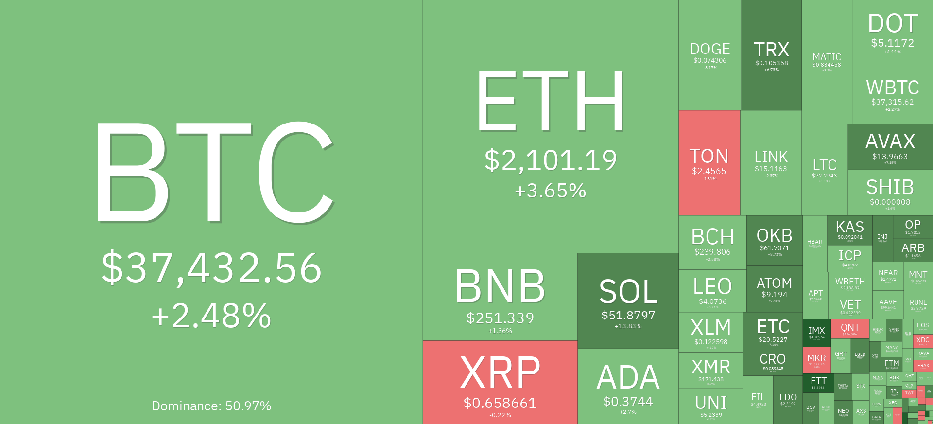 The crypto market is up today as Bitcoin (BTC), Ether (ETH), Cardano (XRP), Solana (SOL) and numerous altcoins rallied as investors’ positive sentiment toward crypto continues to rise. The positive growth was led by Ether, which hit a 6-month high after news that BlackRock’s spot Ethereum ETF for the Nasdaq was confirmed.