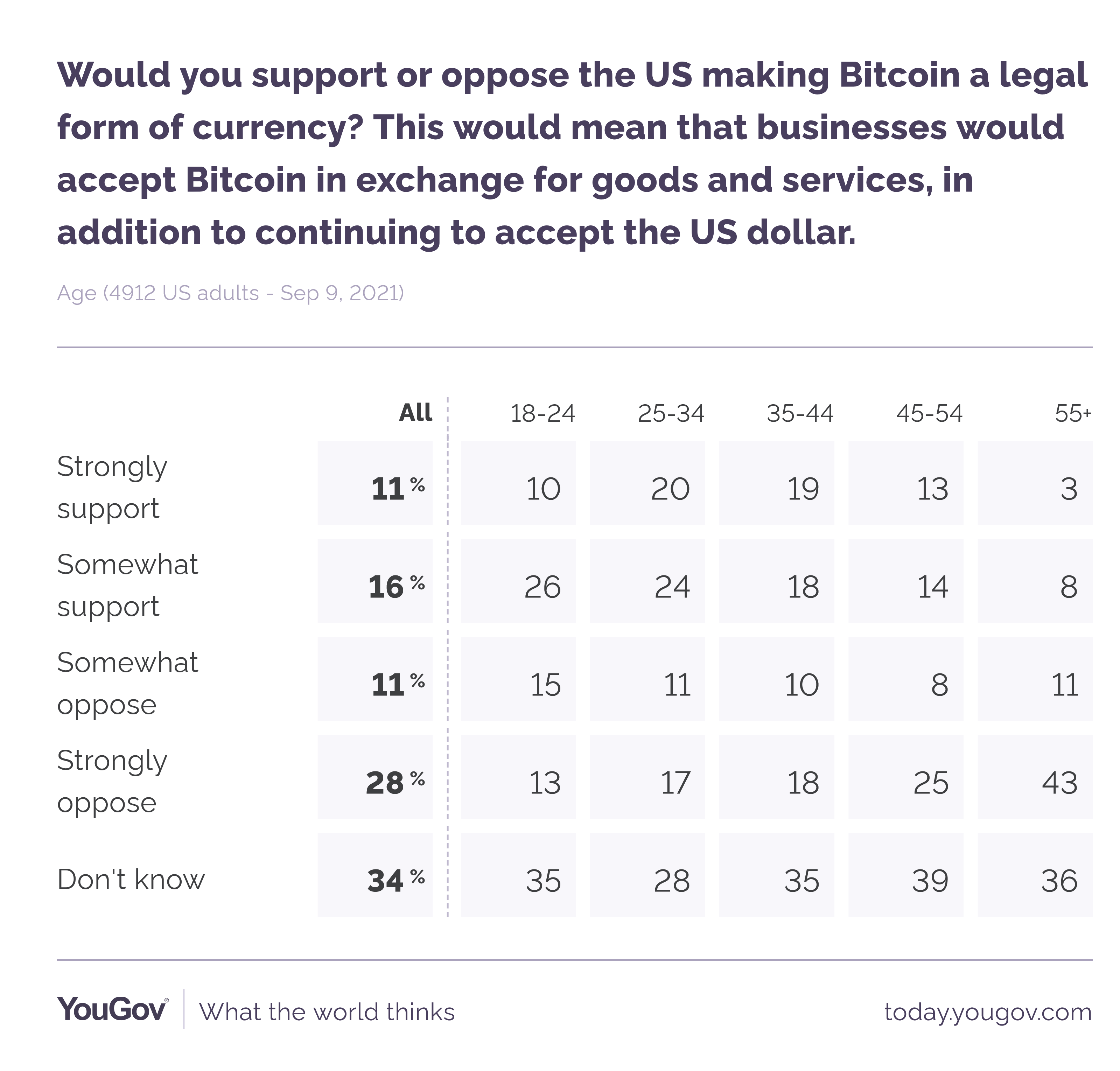 According to a poll from research and data analytics firm YouGov, 11% of respondents “strongly support” the idea that Bitcoin should be used as legal tender in the United States and a further 16% of respondents would “somewhat support” it.
